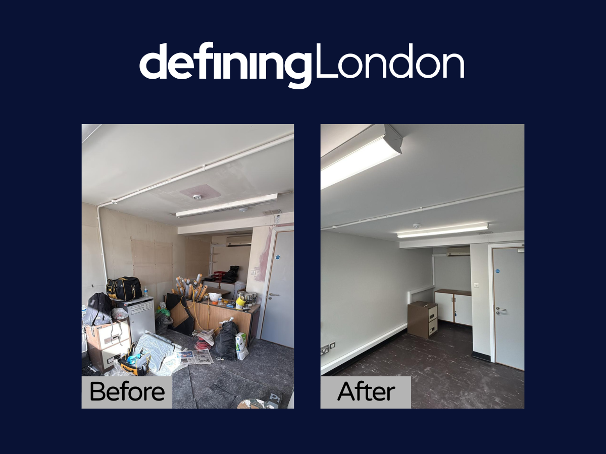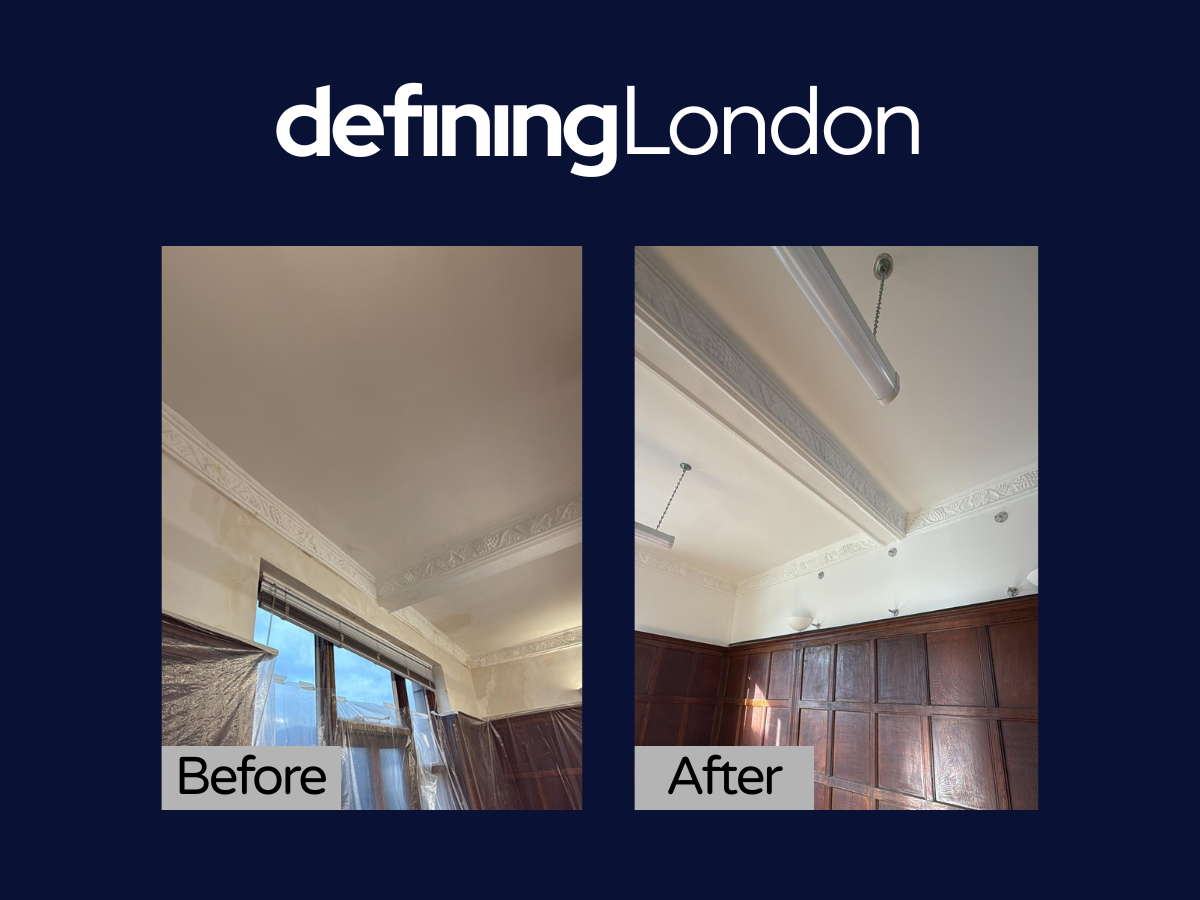 Office in Merton affected by a long-term leak, causing damp, staining and flaking paint. Walls and ceilings were treated, repaired and repainted. Works carried out at weekends to avoid disruption.