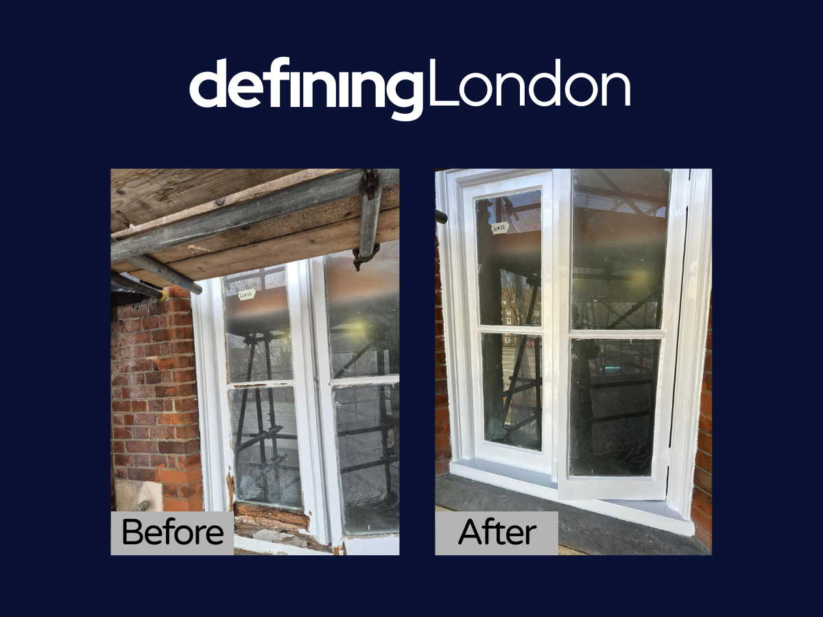 Timber window in Lambeth repaired and repainted for an education sector client. Rotten sections were removed and replaced with new timber, with repairs completed using resin.