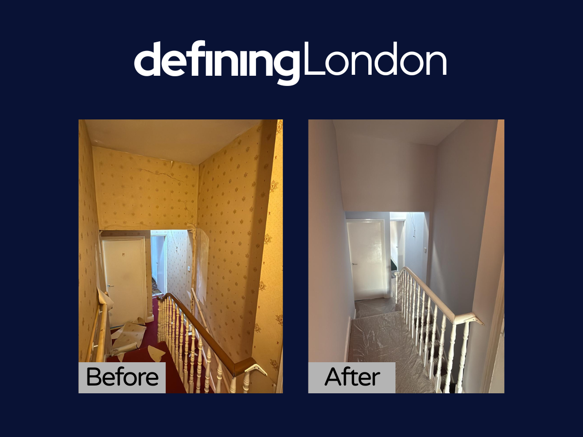 House refurbishment and painting project in Upper Holloway, London, including plastering, wallpaper removal, and lining paper installation.