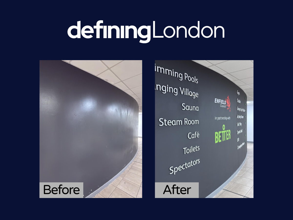Reception maintenance in Enfield. Entrance wall and skirting were repaired and repainted in matching colours to achieve a perfect finish before new signage was installed.