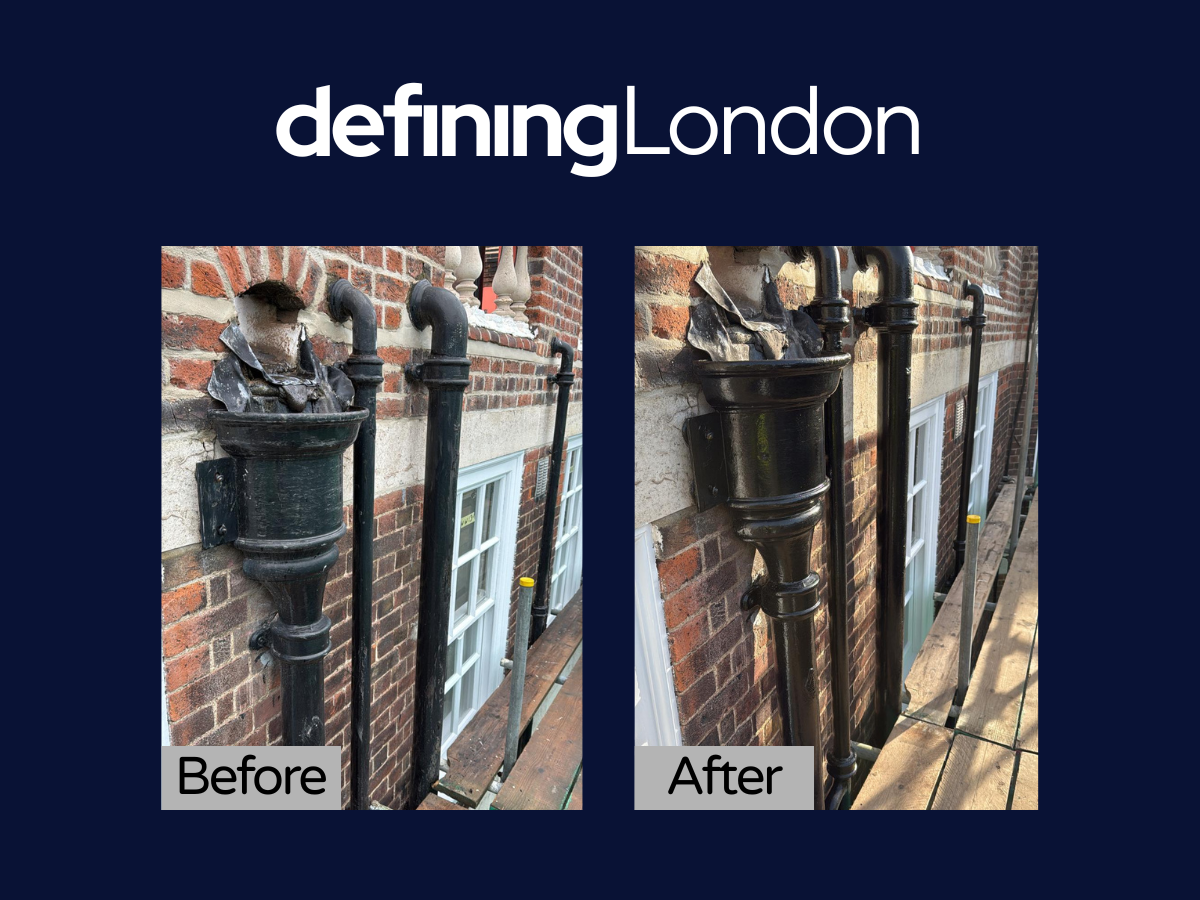 Downpipes at a Swiss Cottage block of flats sanded, primed where rusty, and repainted.